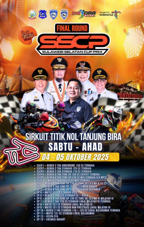 BULUKUMBA,BERITASELATAN.COM – Event balap motor Final Round Sulawesi Selatan Cup Prix (SSCP) akan dilaksanakan di Sirkuit Titik Nol Bira Bulukumba, pada Sabtu-Minggu, 4-5 Oktober 2025 mendatang.