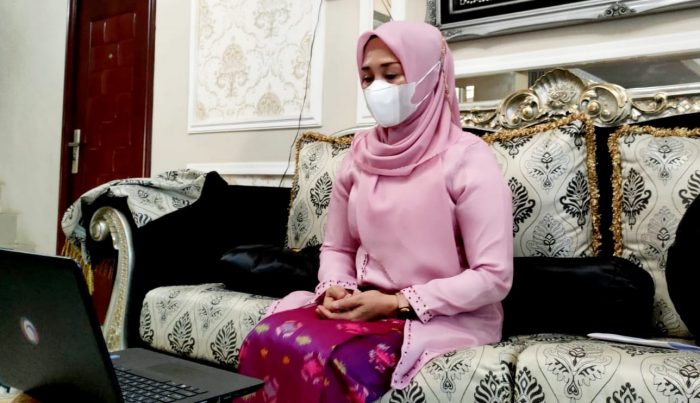 Tampak Andi Musrifah Basli mengenakan rok motif wastra nuansa tenun dipadu kebaya berwarna pig pink mengikuti jalannya acara secara virtual dikediaman pribadinya, Jl. Arif Rahman Hakim Makassar, Jumat, 4 Maret 2022.