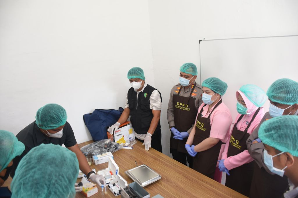 Pada simulasi tersebut, Kapolres juga mengecek dan memantau secara langsung para relawan yang bertugas sesuai bidang masing-masing dalam memperagakan tata cara kerja, termasuk pelaksanaan uji sampel keamanan pangan (food security test) sebelum makanan disalurkan kepada penerima manfaat.