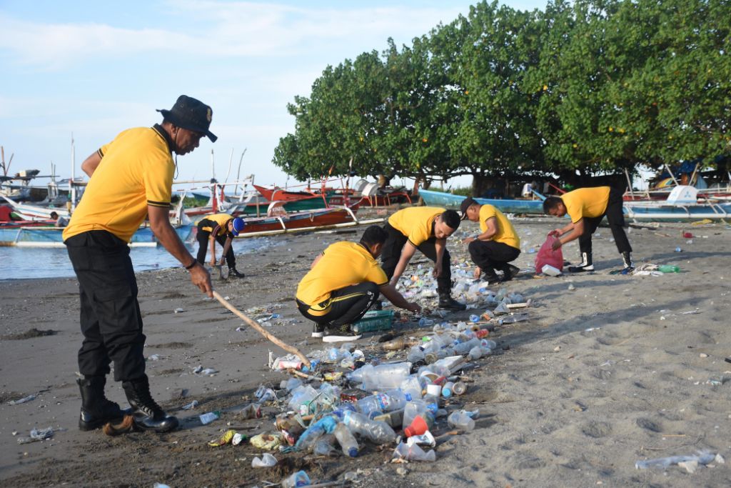 Dengan mengenakan seragam olahraga warna kuning, para Polisi membersihkan sampah dan limbah plastik di sepanjang pesisir pantai. Sehingga pantai kembali terlihat bersih.