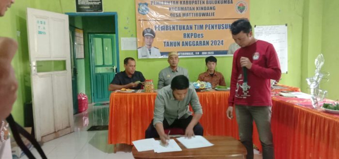BULUKUMBA,BERITASELATAN.COM – Pemeritah Desa Mattirowalie Kecamatan Kindang, Bulukumba melaksanakan Musyawarah Desa guna pembentukan tim penyusun RKPDes guna menyusun rencana kerja ( RKPDesa) Tahun anggaran 2024. Kegiatan tersebut berlangsung di Aula kantor Desa Mattirowalie, Kamis, 15 Juni 2023.